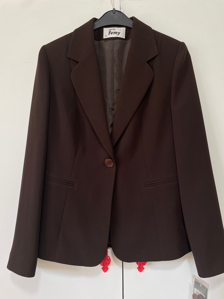 Kahverengi, düğmeli, vatkalı, notched lapel yakalı kadın blazer. Uzun kollu, midi boy, sentetik kumaştan, klasik şıklık için ideal.
