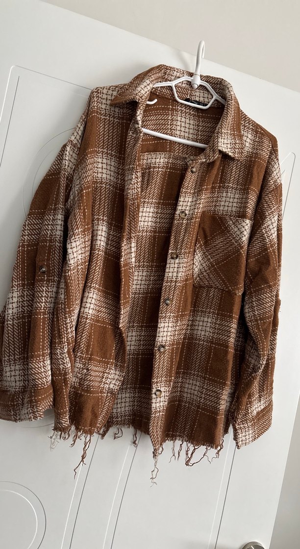 Kadınlar için kahverengi ekose desenli, düğmeli, uzun kollu, normal boy ve salaş kesim gömlek. Notlu yaka ve salaş, yırtık detaylı etek ucu bulunur. L-XL sakal oduncu gömlek