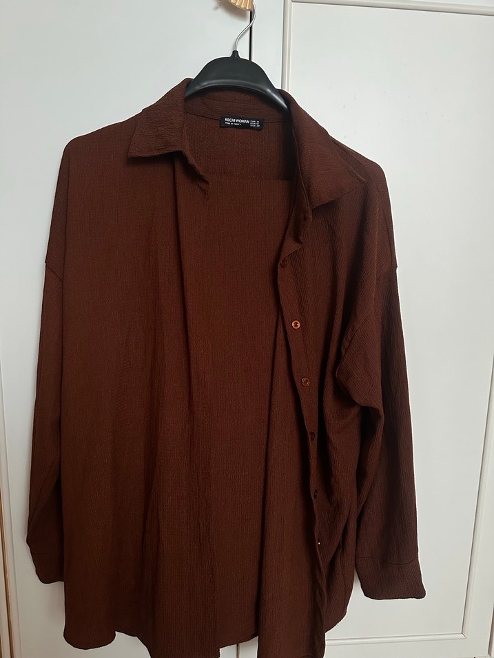 Kahverengi keten gömlek, uzun kollu ve düğmeli. Notch yaka ve bol kesim, midi boyda, günlük rahat stil için uygun.