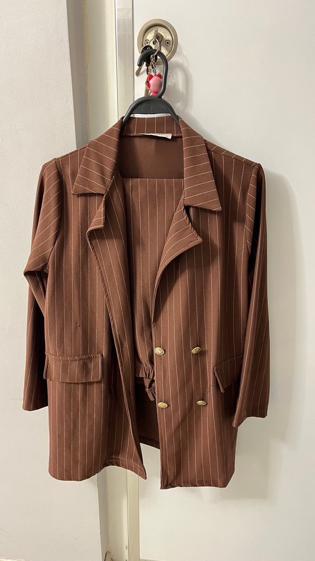 Kadınlar için kahverengi, düğmeli, midi uzunlukta blazer. Sentetik kumaştan üretilmiş, normal kesim ve askılı kollara sahip, ofis kullanımı için uygundur.