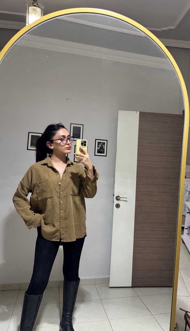 Kadın kahverengi gömlek, uzun kollu, düğmeli ve salaş kesimdir. Yumuşak keten kumaştan yapılmış, notlu yaka ve iki cep içerir. TERTEMİZ ÜRÜNÜM