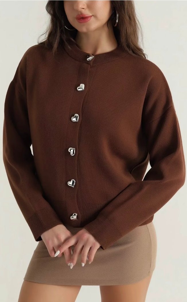 Kahverengi triko hırka, yuvarlak yaka ve uzun kolludur. Düğmeleri kalp şeklindedir, rahat ve trend sokak stiline uygundur. Günlük kullanıma idealdir.