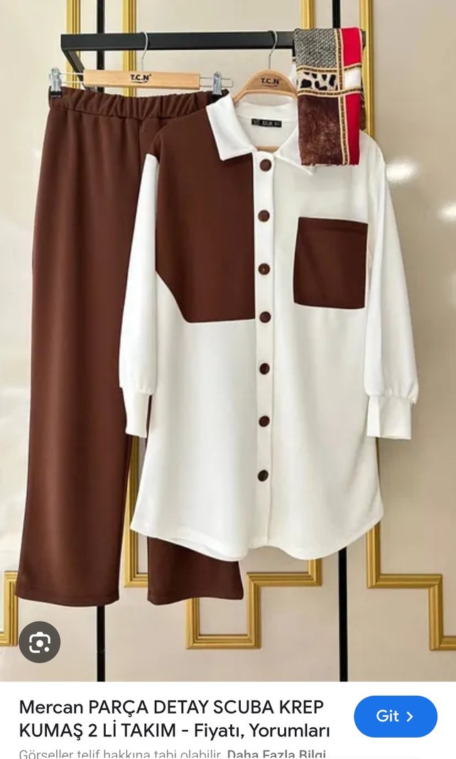 Kadınlar için düğmeli, yakalı uzun gömlek ve kahverengi pantolondan oluşan pamuklu takım. Rahat kesimi ve minimal tarzıyla günlük kullanıma uygundur.
