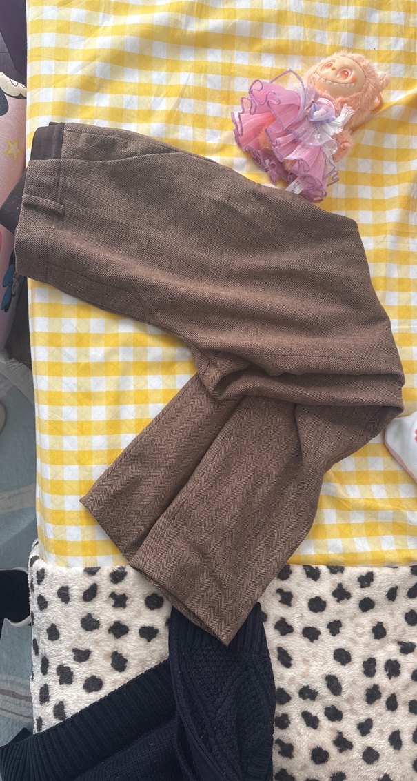 Bol kesim, kahverengi kumaş pantolon, normal midi boyda ve tokalı detaylıdır. Rahat ve günlük kullanım için uygundur.