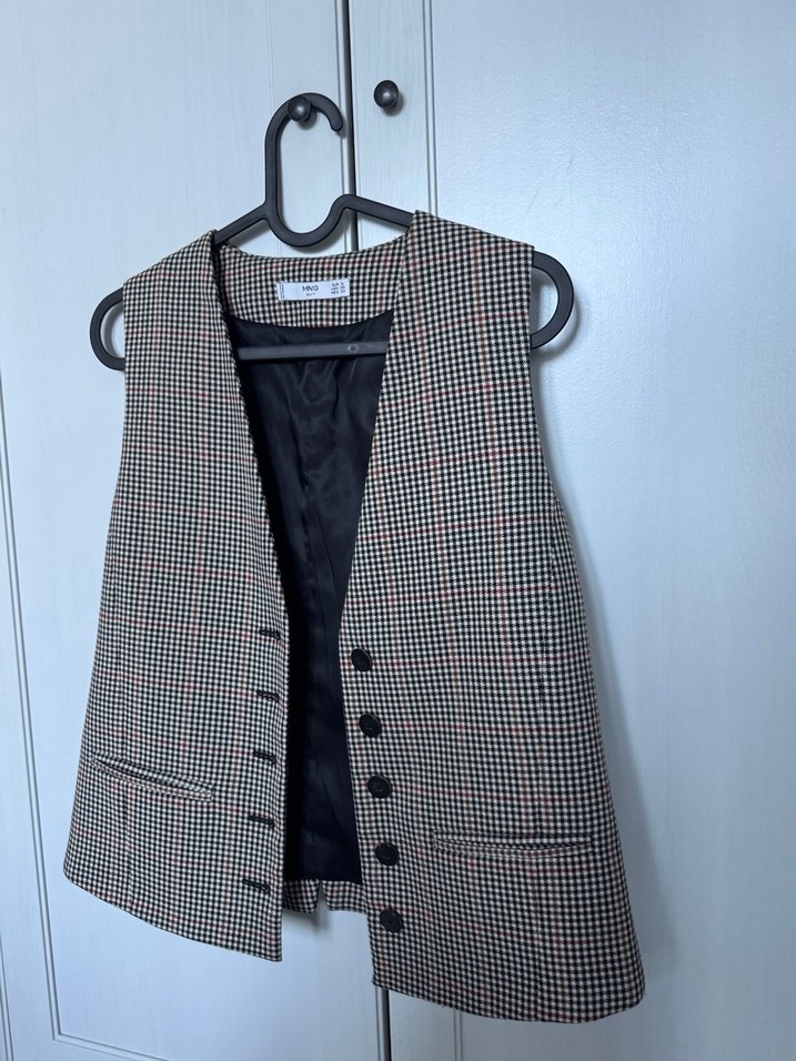 Kahverengi ekose desenli, düğmeli, kolsuz kadın yelek. Normal boyda, notched lapel yakalı, ofis kullanımı için uygun.