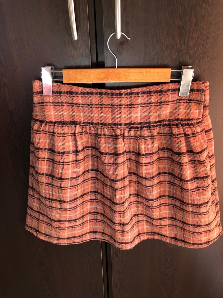 Kahverengi yün kumaştan, bol kesim ve pileli, rahat ekose desenli kadın mini etek. Bohem tarz için uygundur.