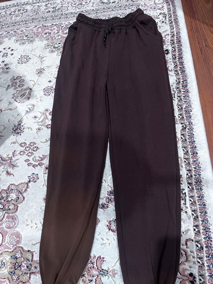 Kadınlar için kahverengi salaş kesim, bağcıklı ve bağcıksız, yumuşak sentetik kumaştan yapılmış rahat eşortman altı Günlük kullanım için uygun.