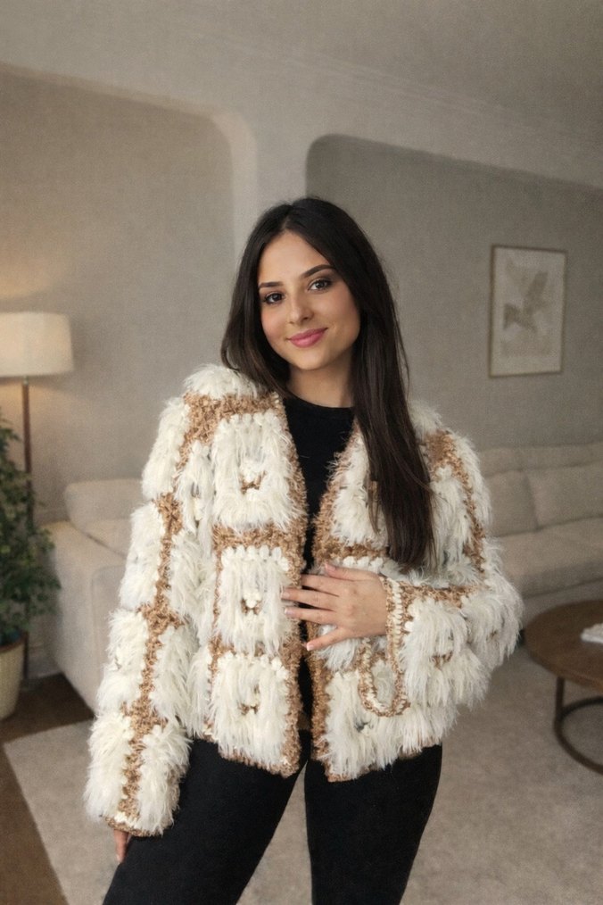 Kadın kahverengi etnik desenli triko ceket, kürk detaylı. Bol kesim, uzun kollu, yakası kesik, rahat ve bohem tarzda günlük kullanıma uygun. Sipariş üzerine örülmektedir