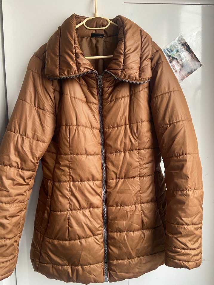 Kadınlar için parlak kahverengi fermuarlı, uzun kollu, kısa kesim kaban. Yumuşak keten kumaştan, genç ve şık günlük kullanım için uygun