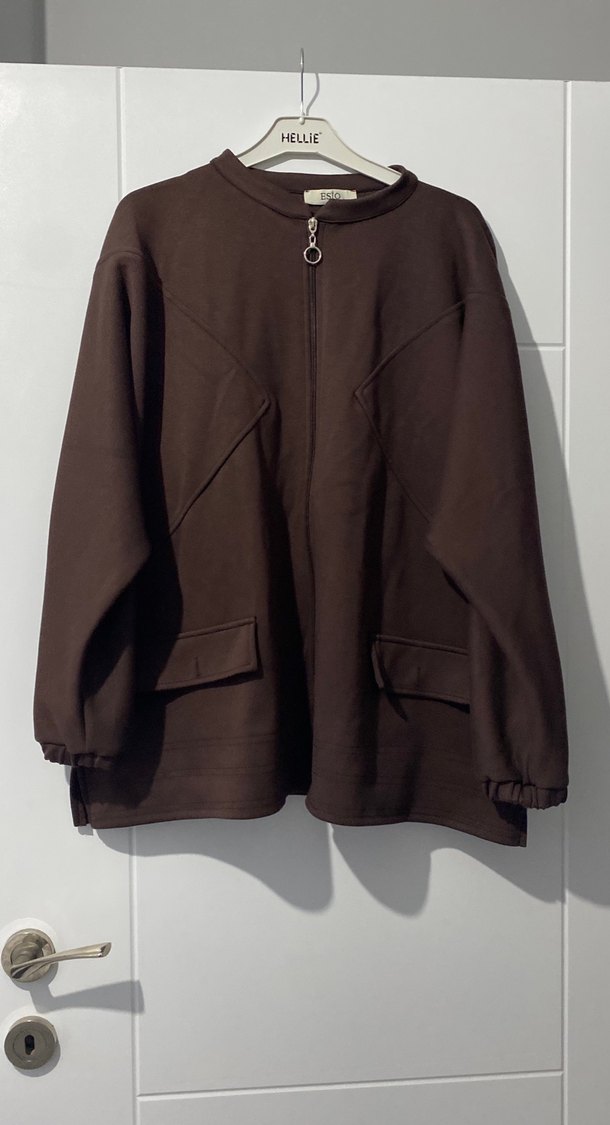 Kadın kahverengi ceket, yuvarlak yaka ve uzun kolludur. Fermuarlı, bol kesim ve normal boydadır. Yumuşak ve sıcak kumaştan üretilmiştir.