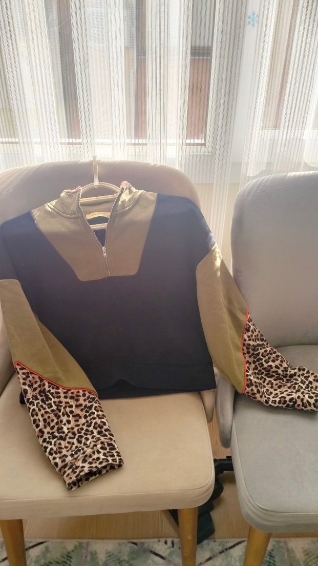 Kadın sweatshirt, fermuarlı yüksek yakalı, uzun ve dar kesim kollu, normal boyda. Kahverengi ve leopar desenli kollarıyla sokak stiline uygun.