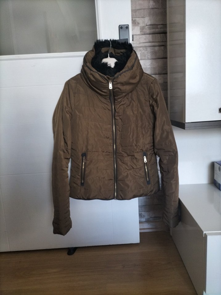 Kahverengi, yüksek yakalı ve fermuarlı, uzun kollu, dar kesim kadın ceketi. Yumuşak ve sıcak kumaştan, sokak modasına uygun.