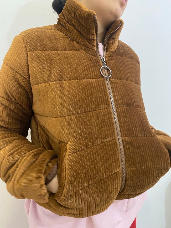 Kadınlar için kahverengi, parlak görünümlü, fermuarlı ve yüksek yakalı mont. Uzun kollu, normal midi boyda, yumuşak ve sıcak kumaştan, şık sokak stili için uygun. Fotograftaki kişi 1.60 boyunda 59 kilo rahatlıkla kullanılabilir