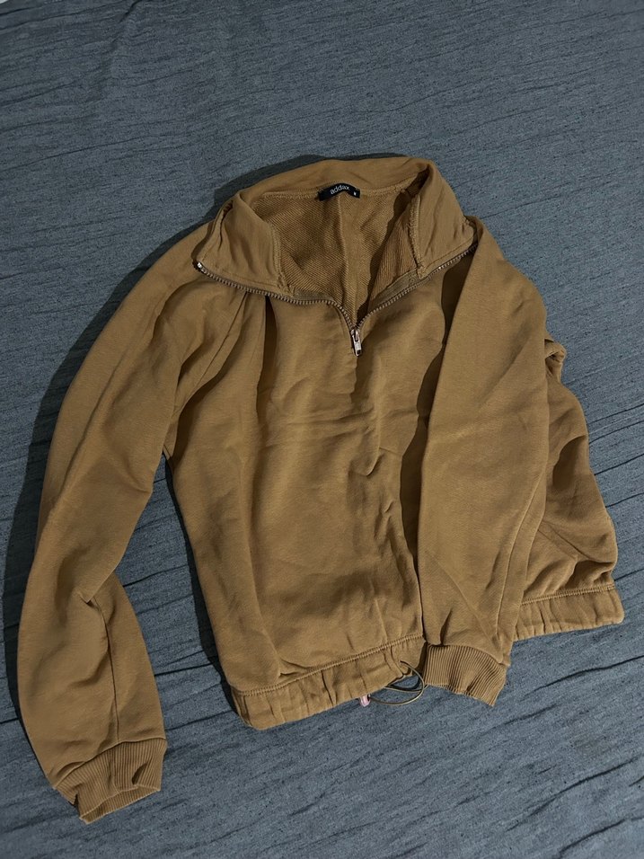 Kadınlar için kahverengi, bol kesim, yüksek yakalı fermuarlı, uzun kollu ve midi boyda yumuşak ve sıcak dokulu sweatshirt. Günlük kullanım için uygun, rahat sokak stili.