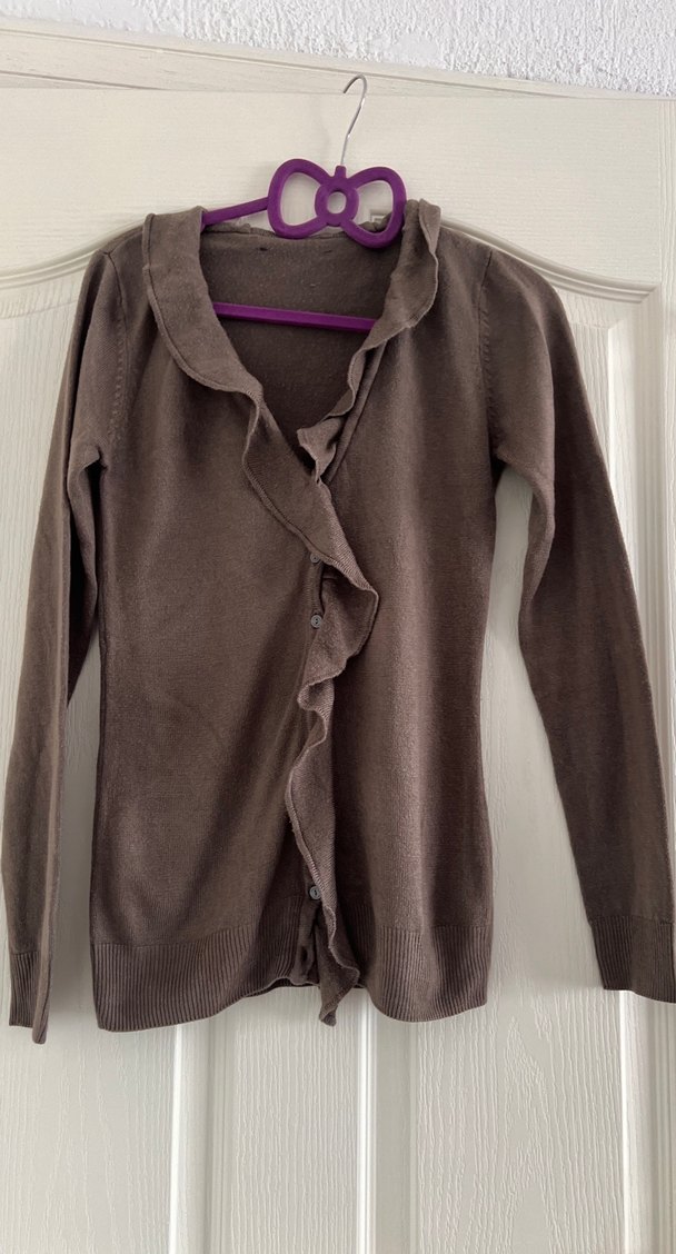 Kadınlar için kahverengi, uzun kollu, V yakalı,slim fırfırlı hırka. Günlük kullanıma uygun, sade tasarım ve rahat stil sunar.