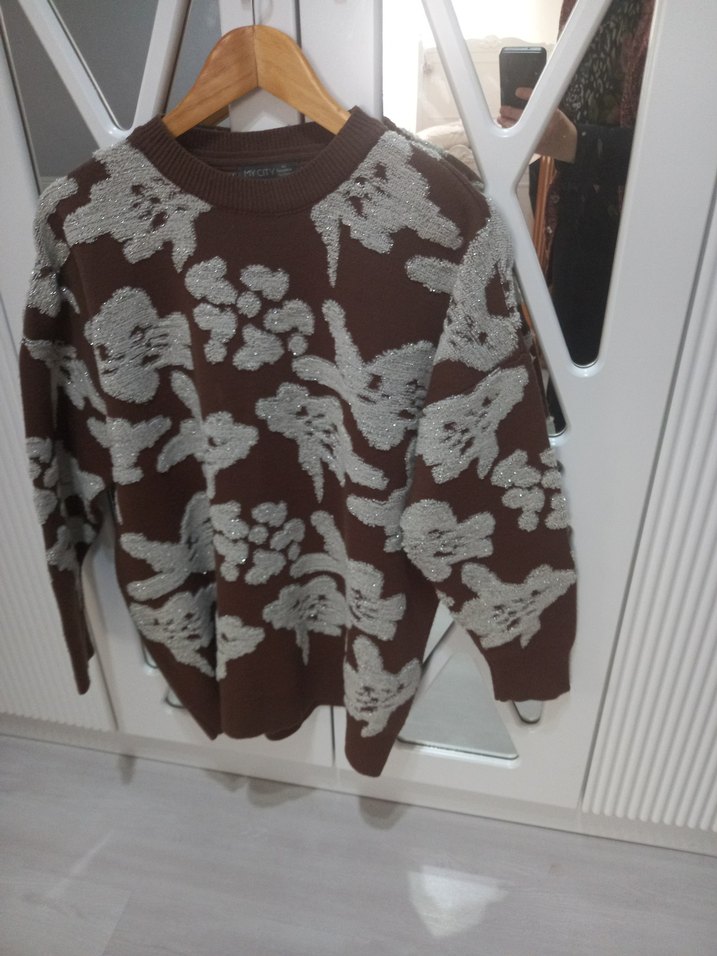 Kadın Kahverengi Gri Desenli Triko Kazak