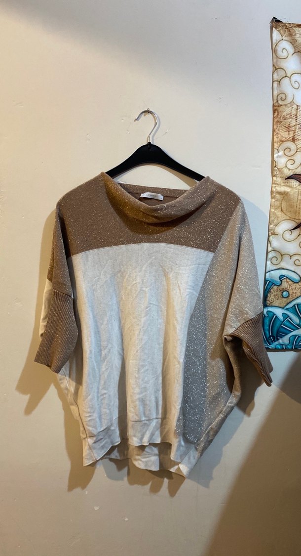 Kadın kahverengi ve gri renklerde, rahat kesim, uzun kollu, yuvarlak yakalı, triko kazak. Sentetik kumaştan örülmüş, midi boyda, günlük kullanıma uygun.