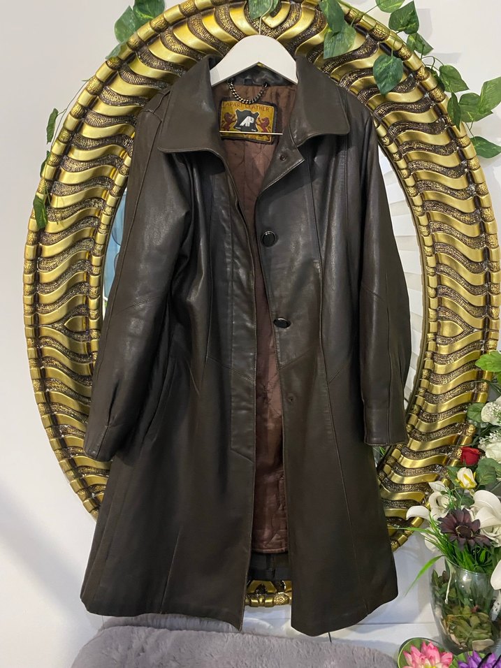 Kadınlar için uzun kahverengi deri ceket, düğmeli bir düğmesi düştü farklı bir düğme diktim dıştan görünmüyor önü ve kırmalı yaka ile. Uzun kollu, regular gerçek deri vintage, bohem tarzına uygun.