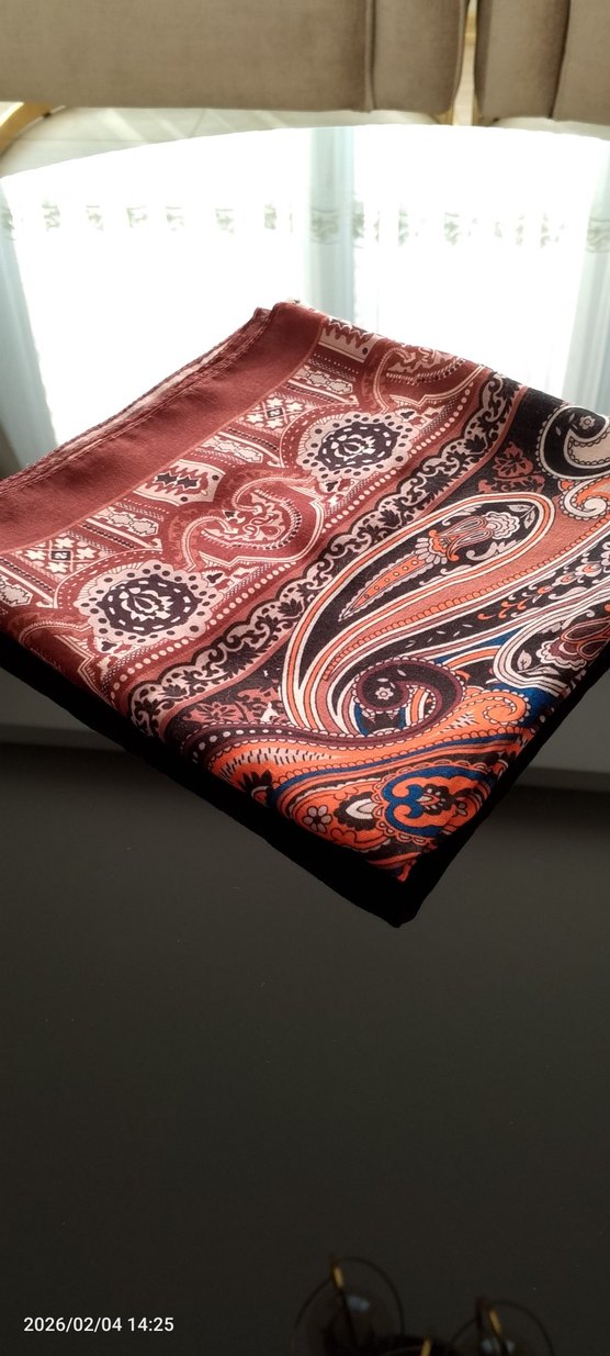 Kadın kahverengi, ipek görünümlü, bohem desenli, drapeli . Retro ve hippie tarzına uygun, şık bir aksesuar. kenarı basımdan beyazlıklar var