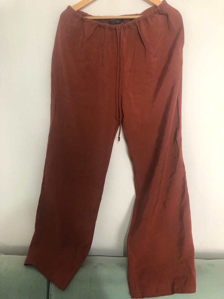Kahverengi, ipek görünümlü, bol kesim midi pantolon. Desensiz ve rahat kesimiyle günlük bohem tarzını yansıtır.