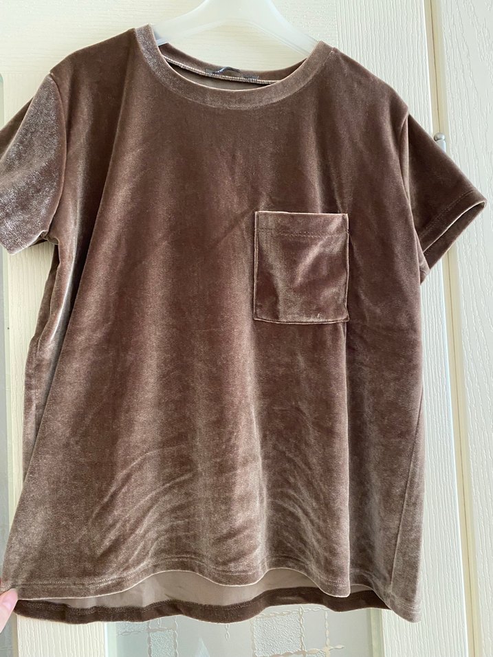 Kadınlar için kısa kollu, yuvarlak yakalı, rahat kesim kahverengi kadife tişört. Normal boyda, göğüs cebine sahip, konforlu ve şık tarz sunar birkaç sefer giyildi
