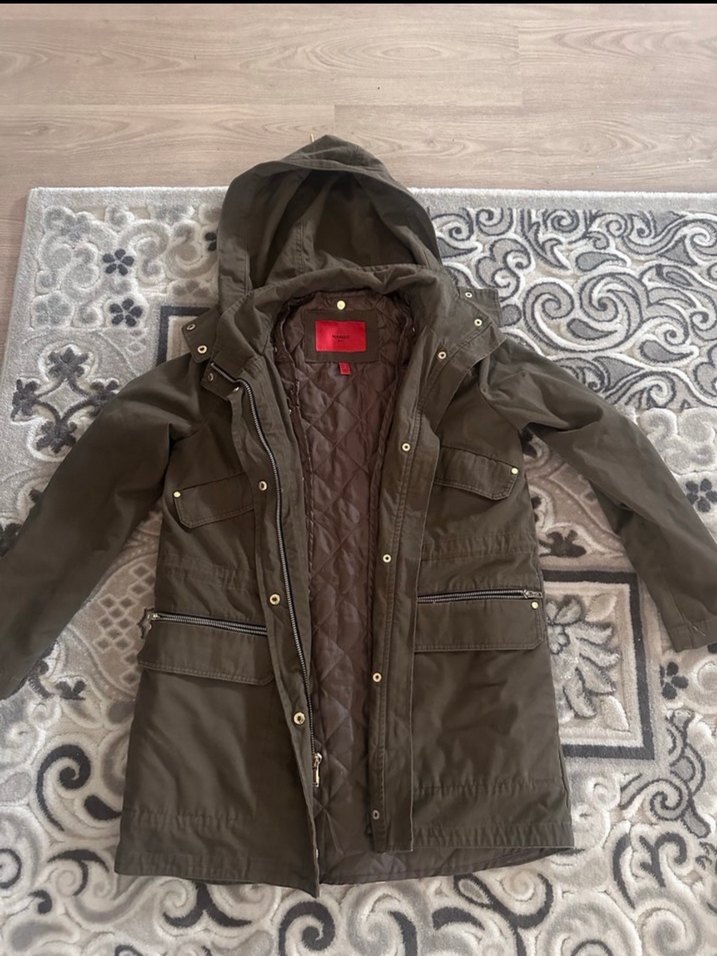 Kadınlar için kahverengi ve gri tonlarında kamuflaj desenli, fermuarlı, uzun kollu, normal midi uzunlukta, sokak stiline uygun fitted kesim ceket. Sentetik kumaştan üretilmiştir.