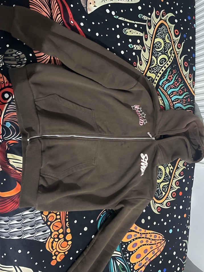 Kadın kahverengi, baskılı, kapüşonlu ve fermuarlı ceket. Uzun kollu, bol kesim ve sentetik kumaştan, günlük kullanıma uygun.