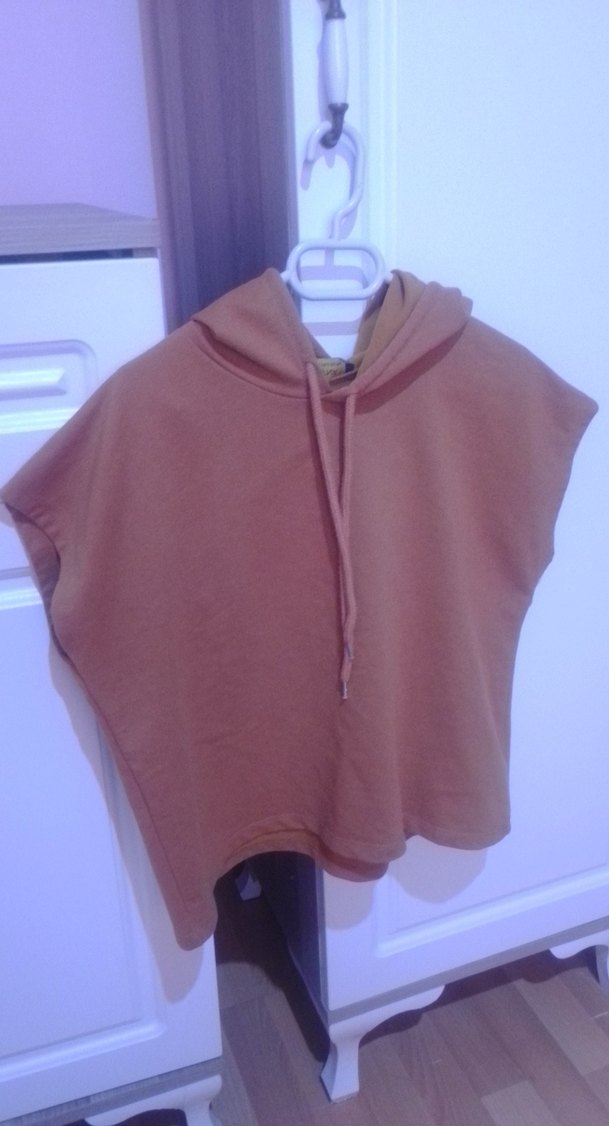 Kadın kahverengi, kapüşonlu, kolsuz, bol kesim sweatshirt. Kısa boy, yumuşak ve sıcak kumaştan, günlük kullanım için uygun.