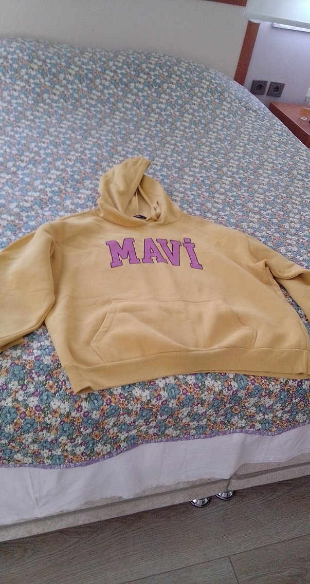 Uzun kollu, kapüşonlu kahverengi sweatshirt, yumuşak dokulu ve bol kesim. "MAVI" baskılı, rahat ve örgü detaylı tasarım.