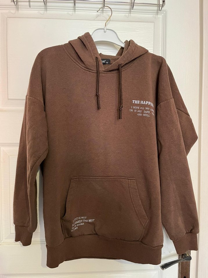 Kadın kahverengi kapüşonlu sweatshirt, bol kesim ve uzun kolludur. Yumuşak, sıcak kumaştan yapılmış, baskılı detaylara sahiptir ve rahat sokak stili için uygundur.