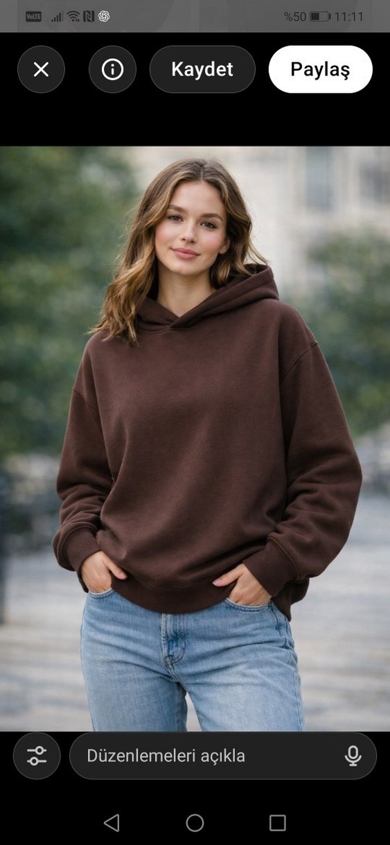 Kahverengi, kapüşonlu kadın sweatshirtü, yuvarlak yaka ve uzun kolludur. Rahat kesimi ve yumuşak dokusuyla günlük kullanıma uygundur.