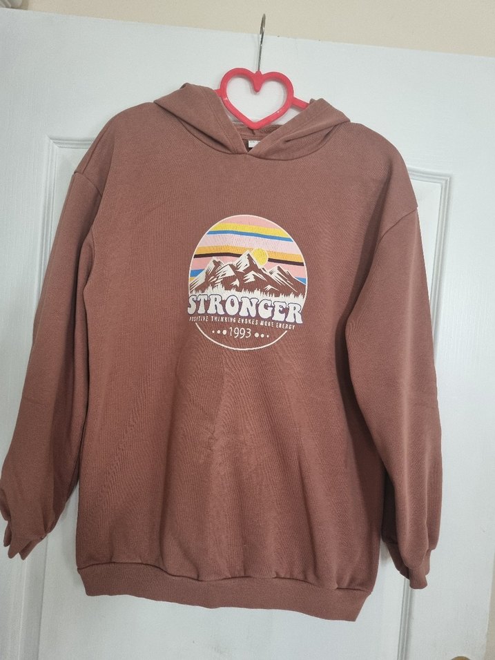 Uzun kollu, yuvarlak yakalı kahverengi sweatshirt. Önünde 'STRONGER, 1993' yazılı dağ baskısı bulunur, yumuşak ve sıcak kumaştan yapılmıştır. ✨