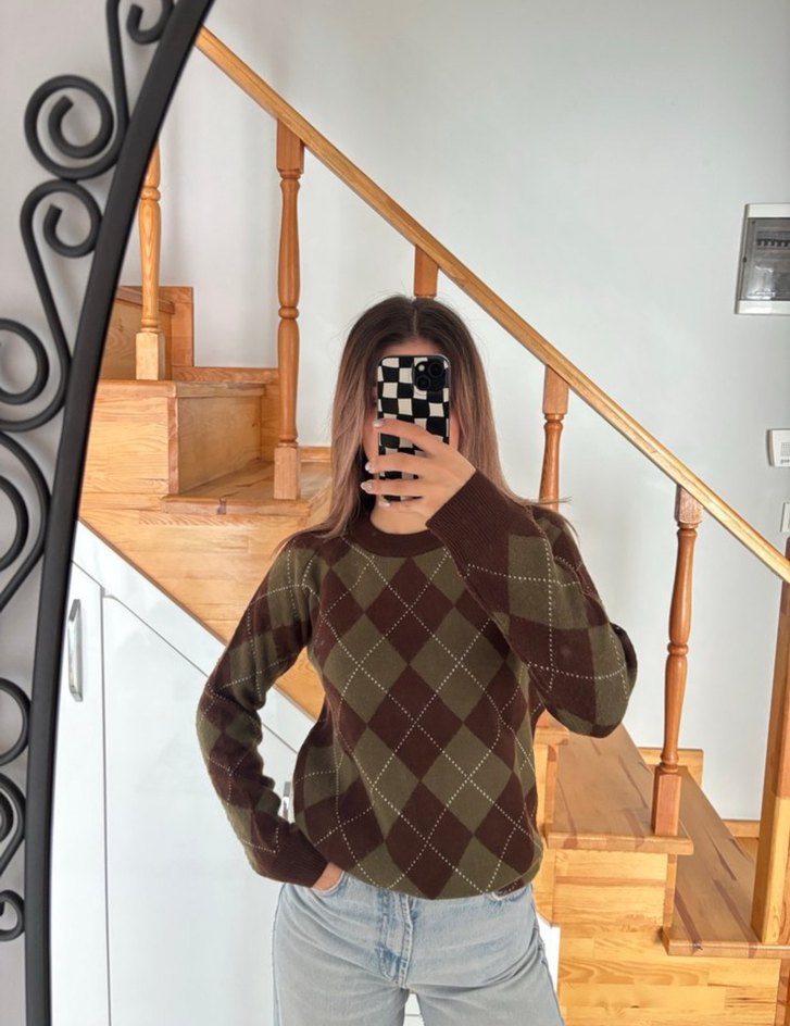 Kadınlar için kahverengi kareli triko kazak, uzun kollu ve rahat kesimlidir. Günlük rahat sokak stili için uygundur.