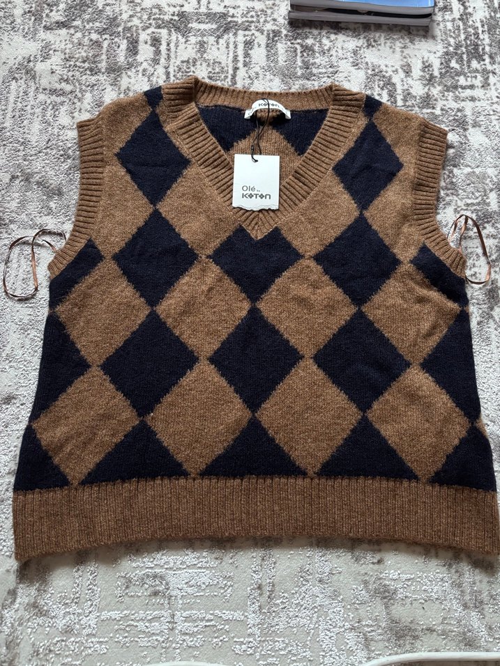 Kahverengi ve siyah kareli desenli, kolsuz triko süveter. Yuvarlak yaka ve bol kesim ile günlük sokak stiline uygundur.