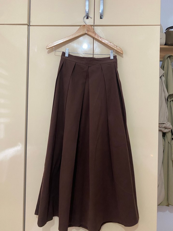 ÖZEL DİKİM Kahverengi, pileli ve bol kesimli uzun kalın kumaştan kadın eteği. Minimalist ve normcore tarzıyla günlük kullanıma uygundur.91cm