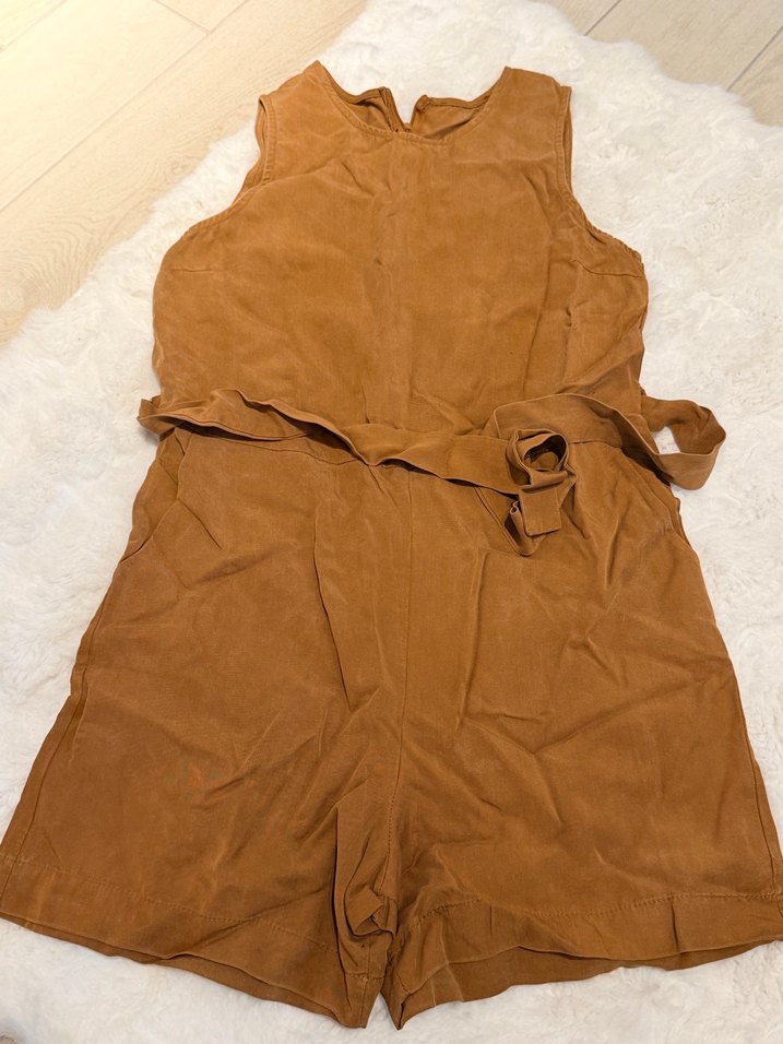 Kahverengi süet kumaştan, kemerli, yüksek yakalı ve kolsuz kısa tulum. Midi boy ve bohem tarzda, dış mekan kullanımı için uygundur.