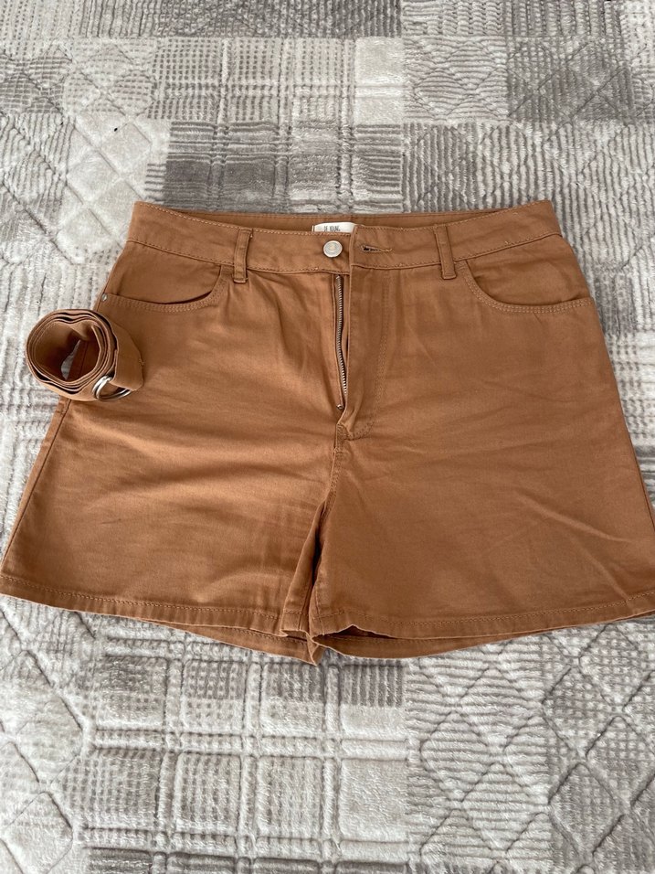 Kahverengi, yüksek bel, kemerli mini şort. aynı renk ve kumaştan kemeriyle birlikte