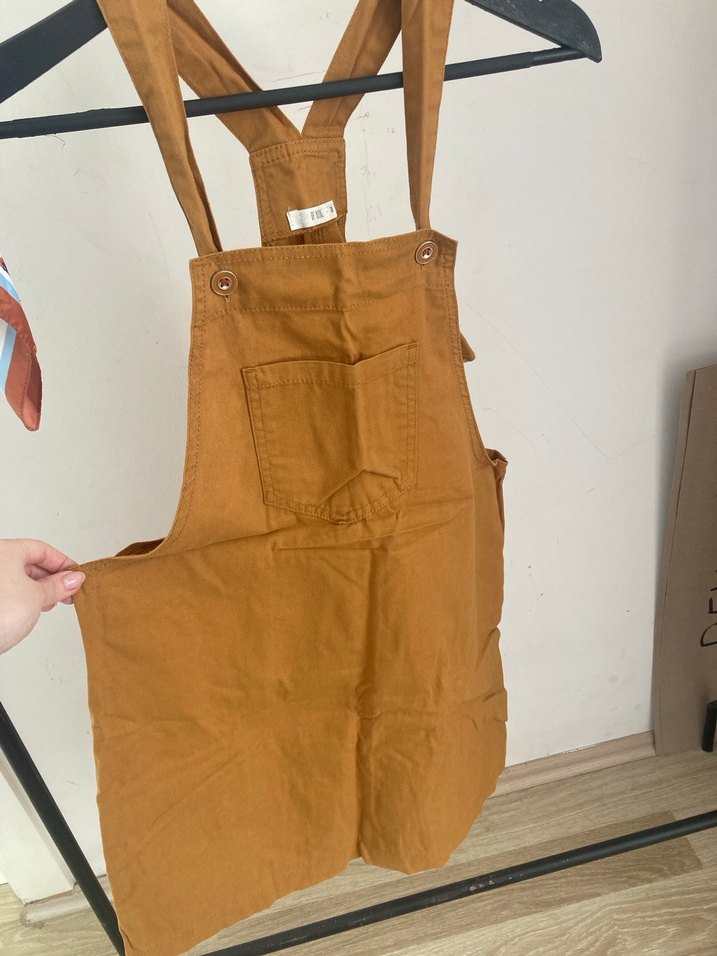 Kahverengi keten kumaştan, askılı, ön cepli bol kesim midi salopet. Günlük kullanıma uygun rahat tasarım.