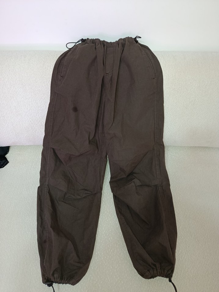 Kadınlar için koyu kahverengi keten, bol kesim ve kemerli midi boy pantolon, rahat ve dış mekan kullanımına uygun. ️
