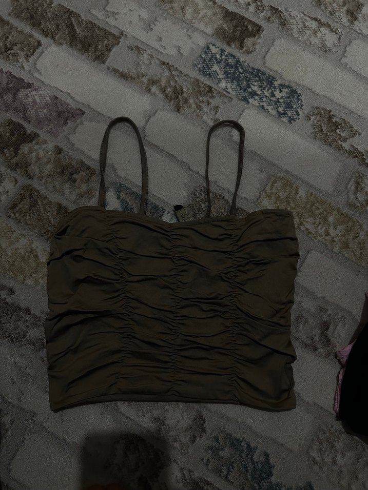 Keten kumaştan yapılmış, kahverengi ve büzgülü, ince askılı straplez kadın büstiyer. Midi boyda, sokak stili için uygun.