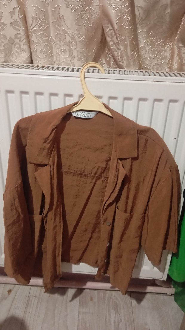 Kahverengi keten kumaştan, uzun kollu, düğmeli, notched lapel yakalı bol kesim gömlek. Desensiz ve günlük rahat stil için uygun.