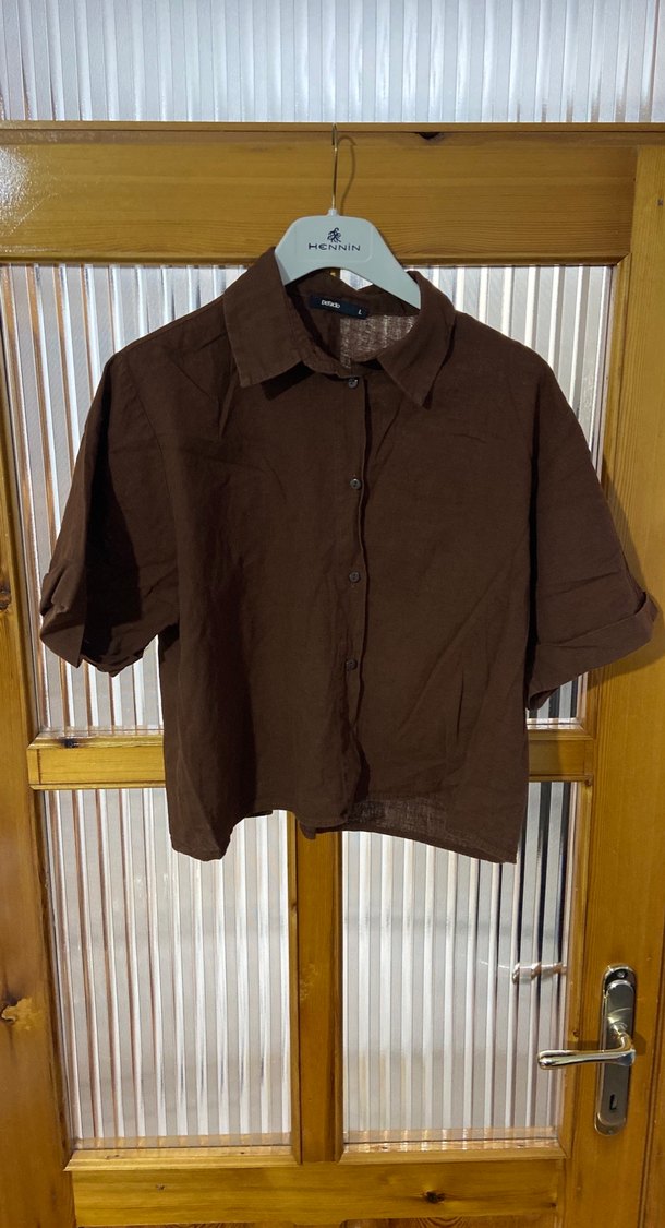 Kahverengi keten kumaştan, kısa kollu, yakalı ve düğmeli kadın gömleği. Rahat kesim ve kısaboyda, günlük sokak stili için uygun.
