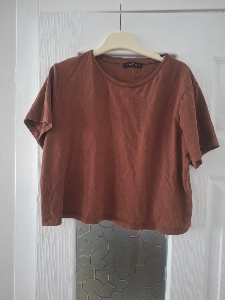 Kadın Kahverengi Keten Kısa Kollu Tişört