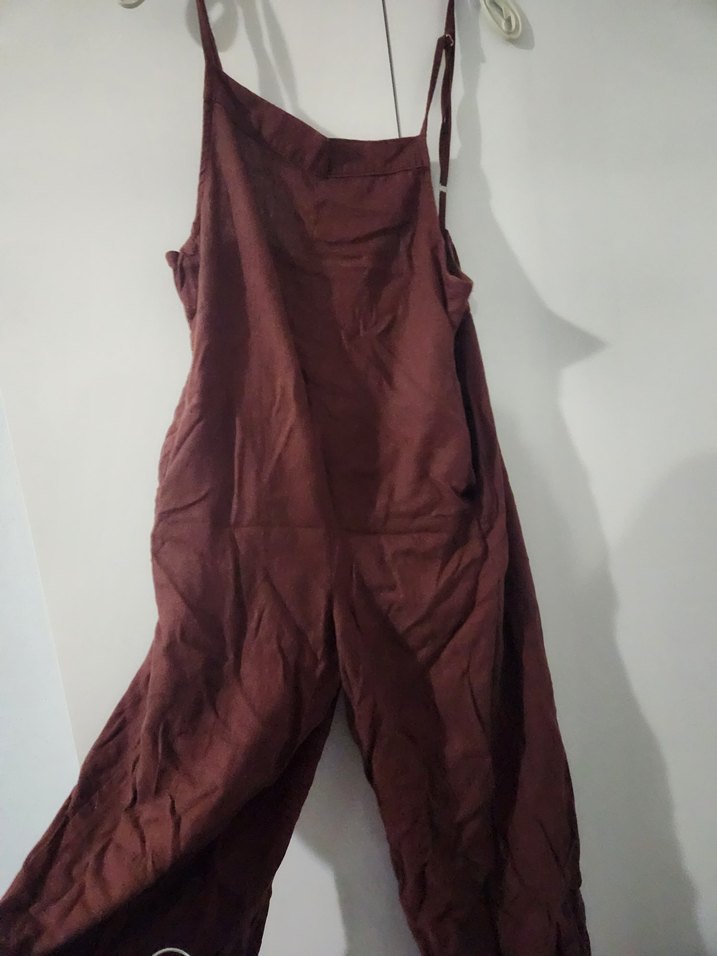 Bol kesim, askısız kahverengi keten tulum. Midi boyda, askılı, drapeli tasarım minimal bohem tarzında. Günlük kullanıma uygundur.