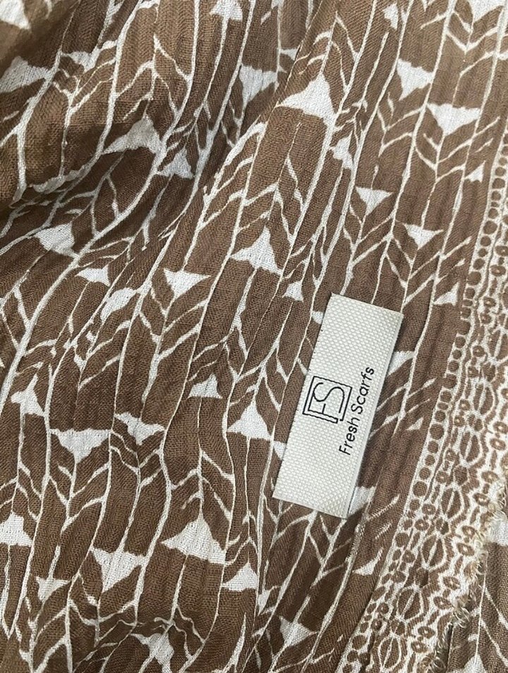 Kahverengi keten kumaştan, pileli dokusu ve bohem tarzıyla rahat, retro görünüme uygun şal. İnce gri desen detayları içerir.