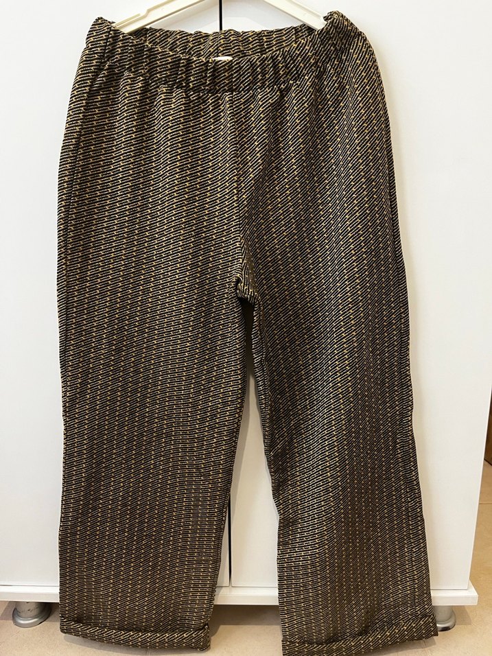 Kahverengi keten kumaştan, pilili ve bol kesim midi uzunluğunda kadın pantolon. Rahat ve günlük kullanıma uygun, trend bir tarz sunar.