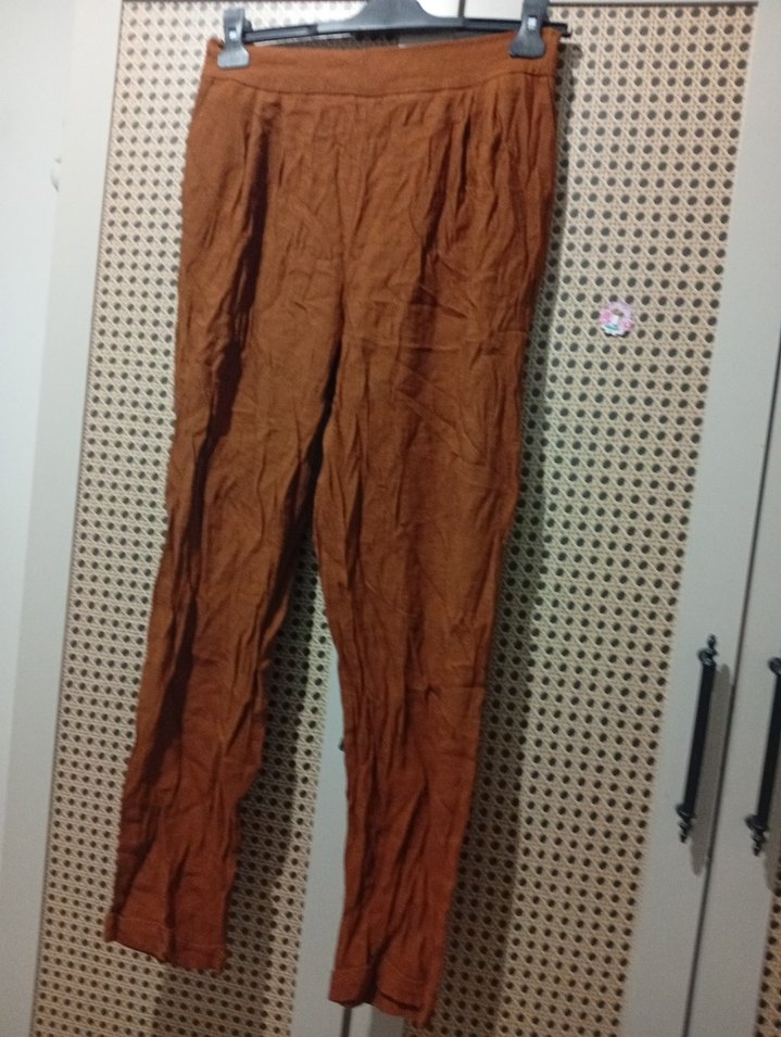 Kahverengi keten kumaştan, pilili ve bol kesimli, midi boyda, desen içermeyen rahat ve günlük kullanıma uygun pantolon.