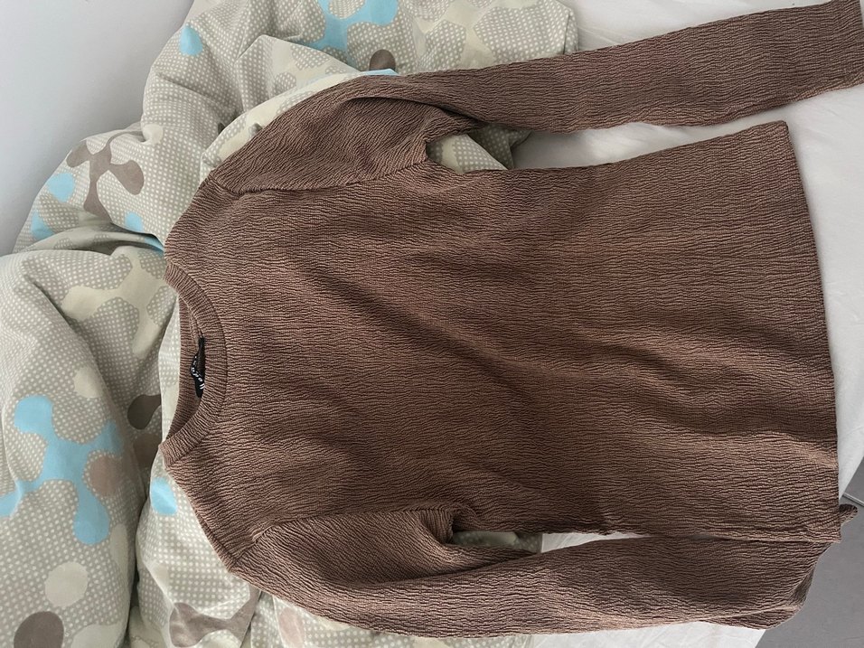 Kadınlar için kahverengi, keten kumaştan, pilili dokulu, uzun kollu ve bisiklet yaka, vücuda oturan kazak. Normal boyda ve sade tasarımlı, günlük kullanım için uygundur. 1 2 kez giyildi.