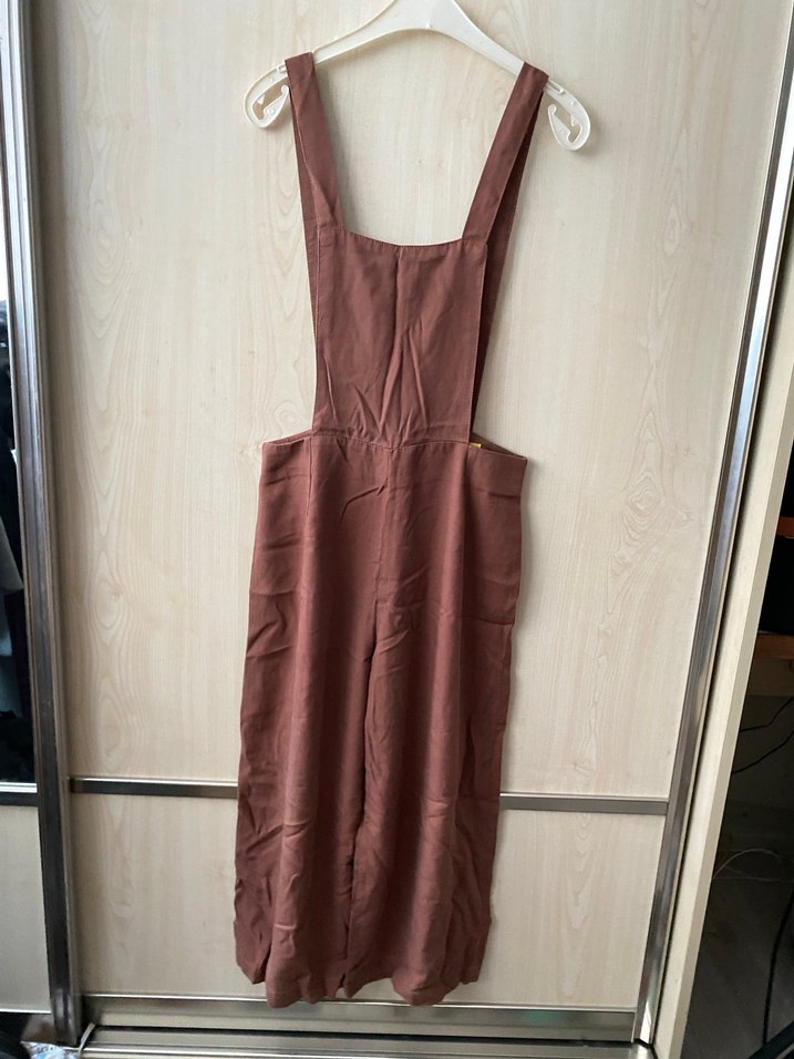Kahverengi keten kumaştan, salaş kesim ve askılı kadın midi tulum. Minimalist ve bohem tarzda, günlük kullanıma uygun. Xs ve s giyene olur streetboxtan alındı sadece popo kısmında kücücük karınca kadar delik vardı siyah iple dikip giymiştim baya küçük, aynı renk iple dikilse o bile belli olmaz son görsele de ekledim