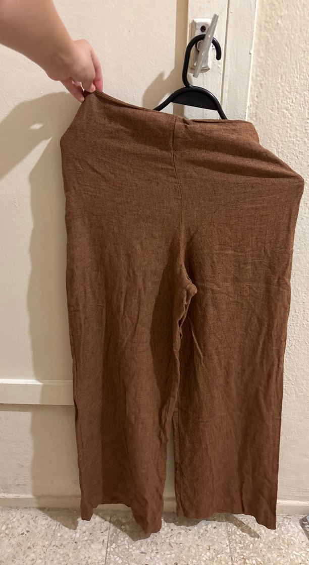 Salaş kesim, kahverengi keten midi boy pantolon, drapeli detaylı, günlük kullanıma uygun sade ve rahat tarzda. Beli daraltıldı yalnızca iki kez giyildi